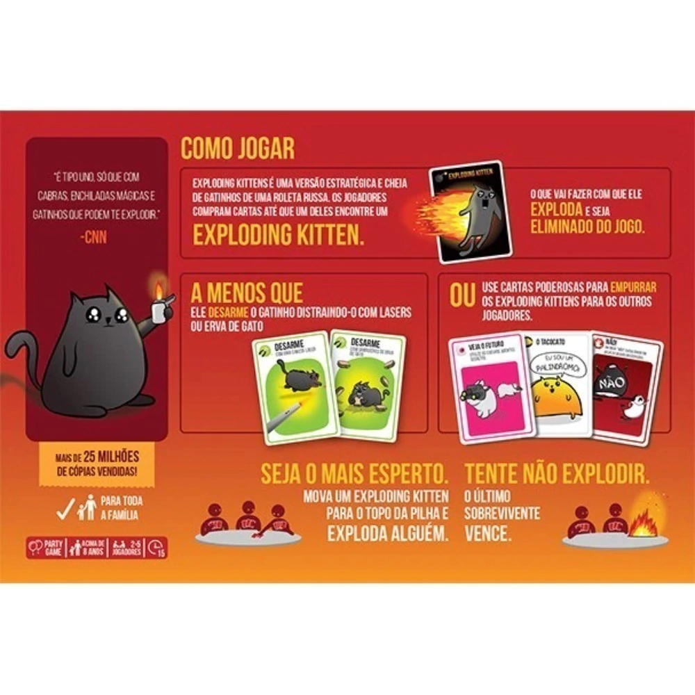 Exploding Kittens é um jogo de cartas rápido e divertido pra jogar com crianças, amigos e família. Os jogadores compram cartas até que um deles encontre um exploding kitten fazendo com que ele exploda e seja eliminado do jogo, a menos que ele desarme o gatinho ou use cartas para empurrá-lo para outros jogadores.