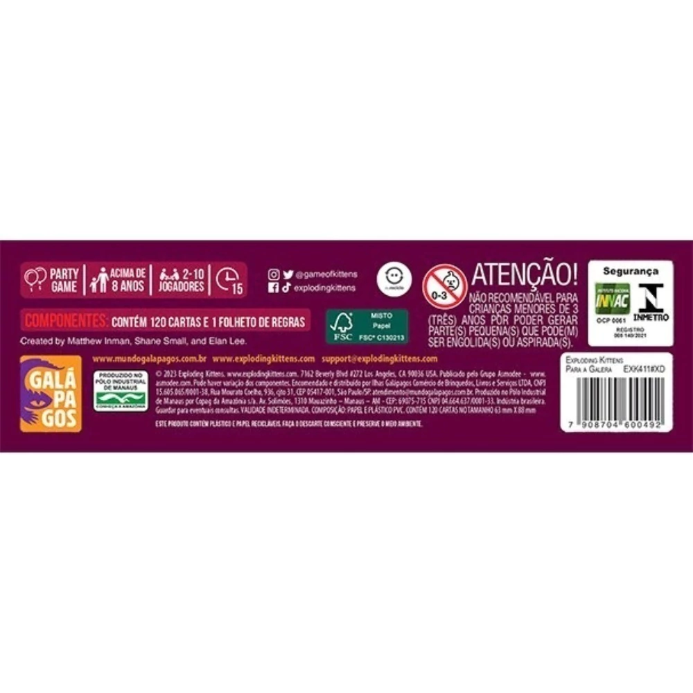 Exploding Kittens: Para a Galera é uma expansão do jogo clássico que te permite jogar com até 10 pessoas. Os jogadores compram cartas até que um deles encontre um exploding kitten fazendo com que ele exploda e seja eliminado do jogo, a menos que ele desarme o gatinho ou use cartas para empurrá-lo para outros jogadores.